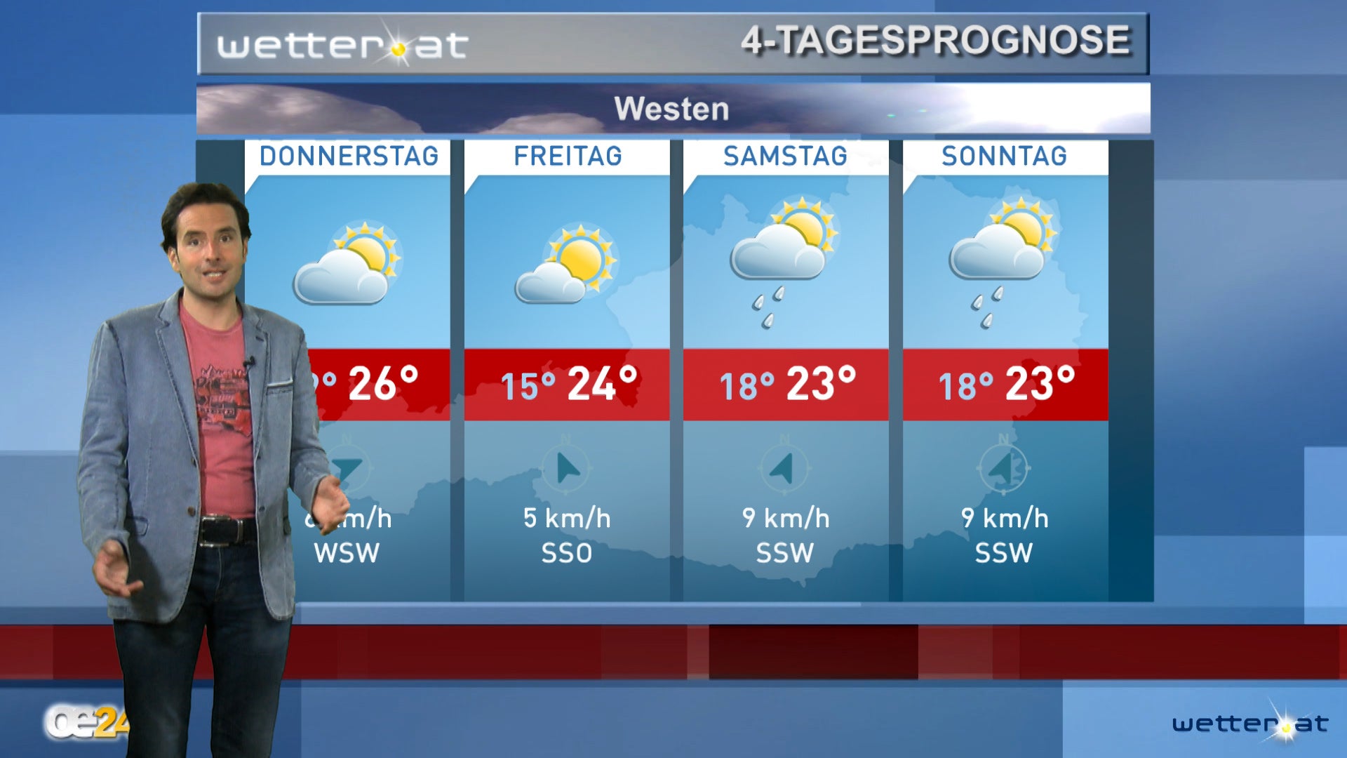 In Westösterreich wird der Feiertag am Donnerstag wolkig bis 26 Grad, der Freitag dann heiter bei frischen 15 bis 24 Grad; Im Süden, Kärnten, der Steiermark, dem Burgenland und von Oberösterreich, bis zum östlichen Niederösterreich wird der Donnerstag ein heiterer Feiertag bei 18 bis 25 Grad, der Fenstertag am Freitag sonnig und schön bis 27 Grad.