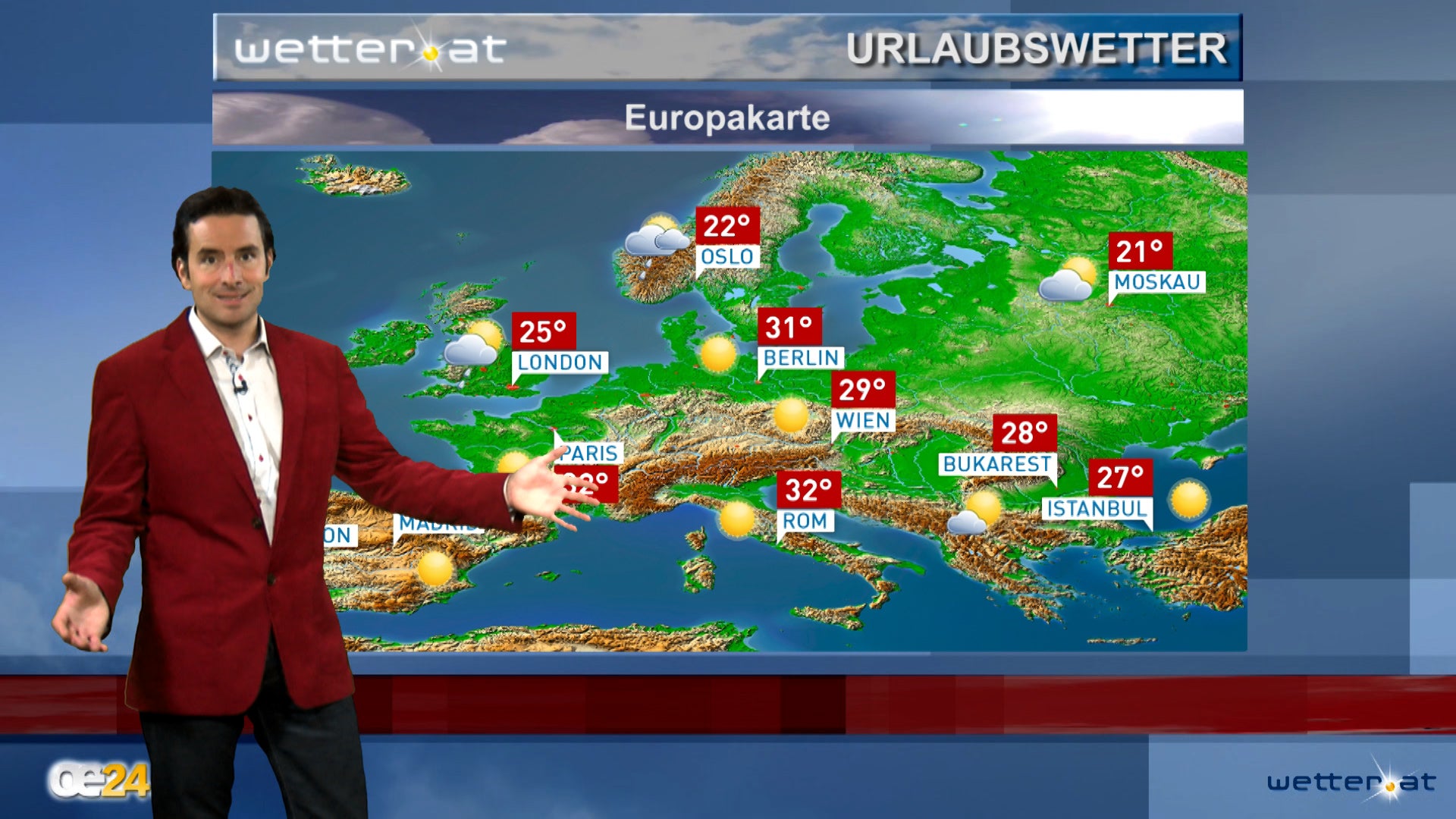 Hoch Antonia liegt über Ostfrankreich. Zwischen diesem neuen Hoch und Tief Bernd über dem Nordatlantik und Nordeuropa weht anfangs noch feuchte Meeresluft zu uns. Wolken mit örtlichen Schauern legen sich daher über das nördliche Mitteleuropa. Ein neuer Schwung Saharaluft dringt über die Iberische Halbinsel nordostwärts vor. Wechselhaft ist es in Skandinavien.