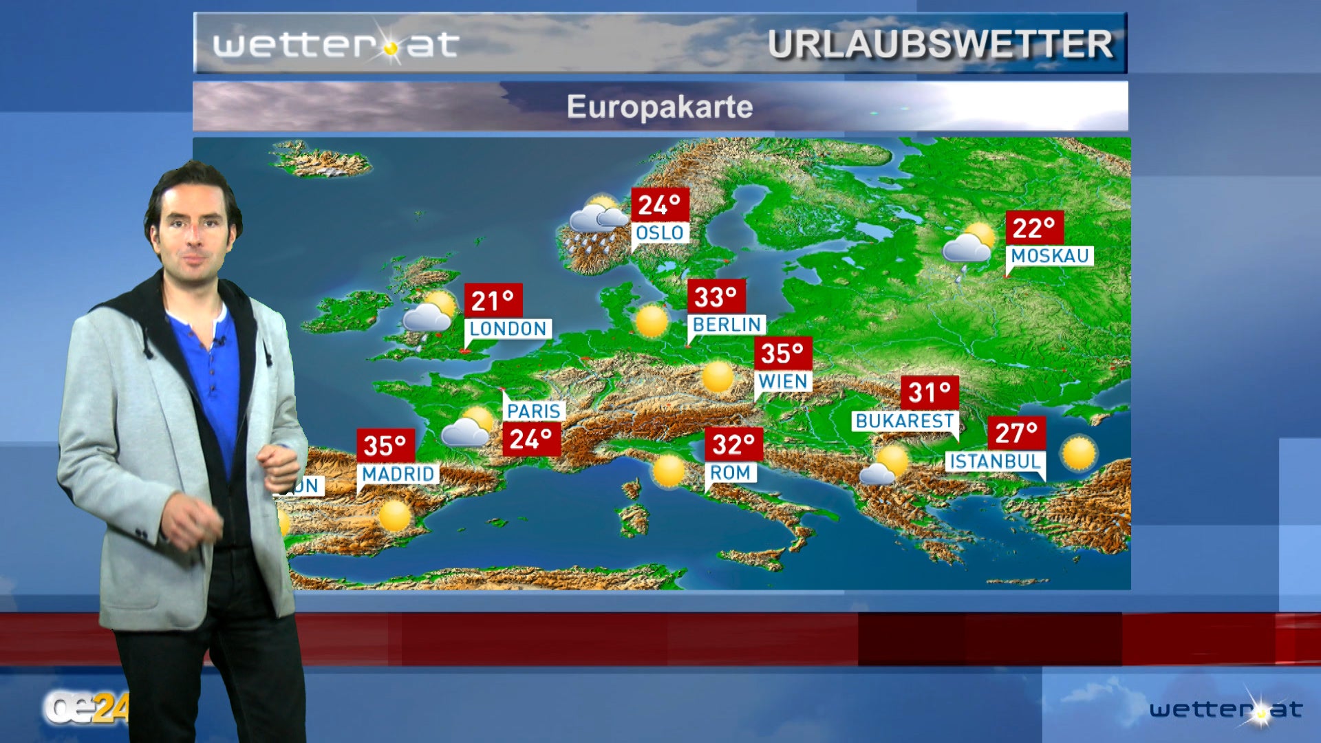 Hoch Antonia liegt über Ostfrankreich. Zwischen diesem neuen Hoch und Tief Bernd über dem Nordatlantik und Nordeuropa weht anfangs noch feuchte Meeresluft zu uns. Wolken mit örtlichen Schauern legen sich daher über das nördliche Mitteleuropa. Ein neuer Schwung Saharaluft dringt über die Iberische Halbinsel nordostwärts vor. Wechselhaft ist es in Skandinavien.
