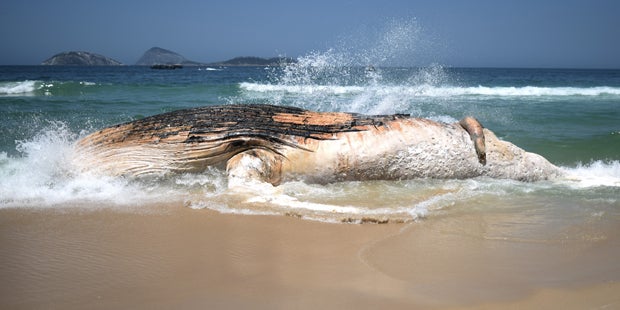 Mitten am Strand von Rio de Janeiro ist ein rund 30 Tonnen schwerer Wal angespült worden. Tausende Badegäste versammelten sich am Mittwoch an dem Strandabschnitt im Stadtteil Ipanema, um das tote Tier zu sehen, das wie ein Fels im Wasser lag. Am Strand war starker Verwesungsgeruch zu riechen, dort lagen auch zwei riesige Kiefer des Tieres.