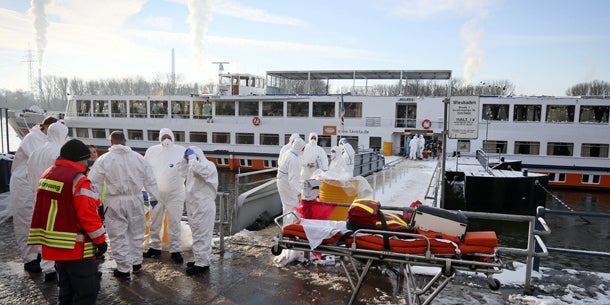 Auf einem Hotelschiff im deutschen Wiesbaden sind in der Nacht zum Samstag mindestens 60 Gäste vermutlich durch Infektion mit Noroviren plötzlich und heftig erkrankt. Die Menschen litten unter quälender Übelkeit und Erbrechen, wie die Feuerwehr am Samstagmorgen berichtete. Die Rettungsdienste waren gegen Mitternacht mit einem Großaufgebot angerückt, um die erkrankten Hotelgäste mit Medikamenten und Infusionen zu versorgen.