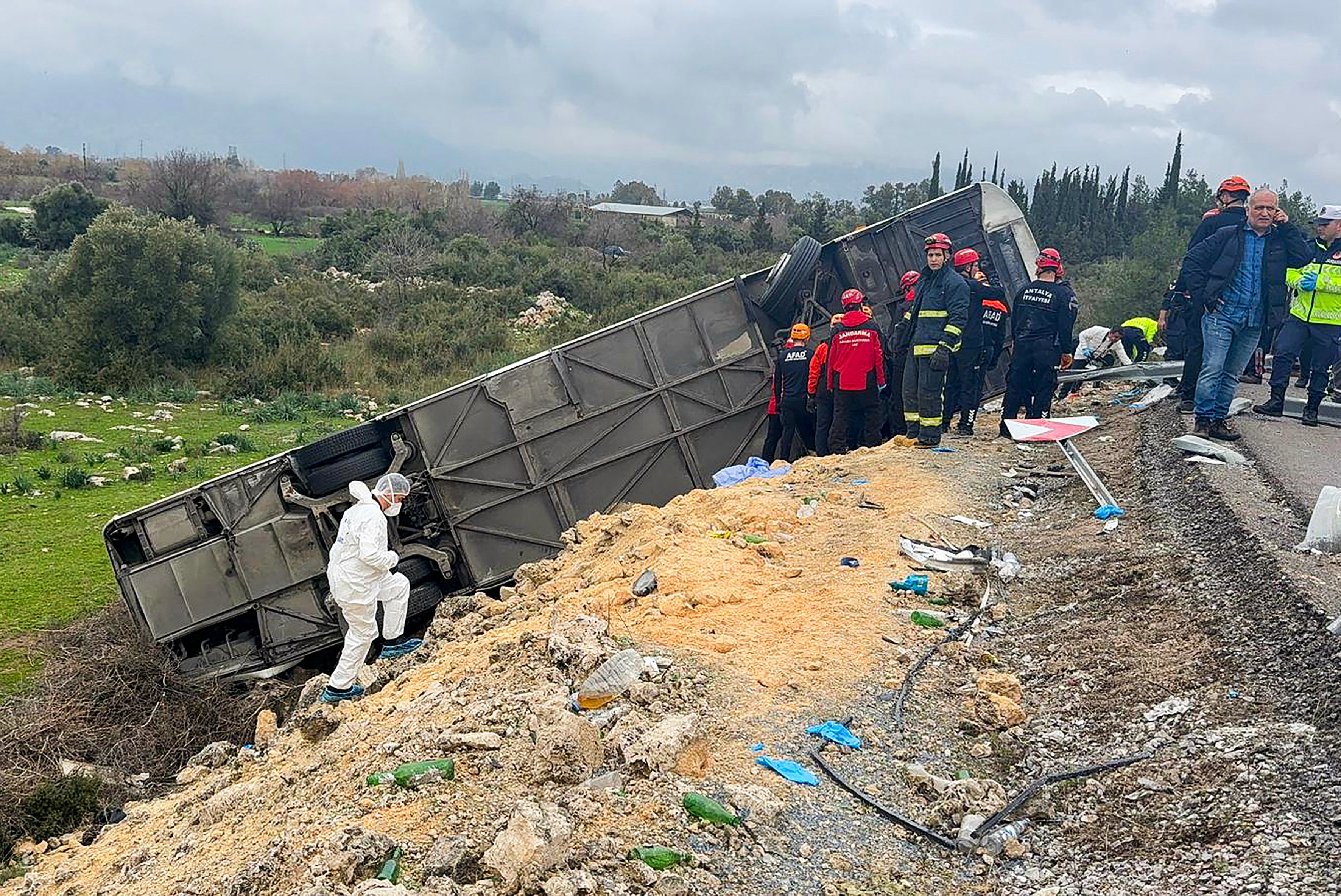 Der Bus fuhr demnach Sonntagfrüh um 10.20 Uhr Ortszeit (08.20 Uhr MEZ) mit 34 Passagieren an Bord aus Tekirdag im Nordwesten der Türkei kommend nach Antalya, als er auf der regennassen Fahrbahn auf einem Autobahnkreuz umkippte. Es sei neblig gewesen, der Bus sei "mit hoher Geschwindigkeit" gefahren, erklärte Gouverneur Sahin.