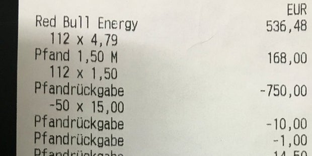 Verrückt: Nach der Rückgabe kaufte sich der Pfandsammler Energydrinks im Wert von 536,48 Euro. Mit 1,50 Euro Pfand für jedes der 112 Sixerpacks Red Bull, hätte der Mann knapp 700 Euro zahlen müssen. Doch durch seine Leergut-Rückgabe musste ihm der Supermarkt sogar noch 106,77 Euro zurück zahlen.