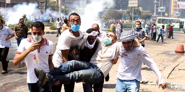 Eine Menschenwalze stürmt auf eine Polizeistation neben dem Ramses-Platz zu. Vom Dach der Polizeistation regnet es Tränengasbomben. Das beißende Gas kriecht in den Rachen, macht kurzfristig blind. Wieder Schüsse. Wer auf wen schießt, ist nicht auszumachen. Über dem Platz kreisen Militärhubschrauber. Wütend schleudern Jugendliche Steine in die Luft. Sie treffen die eigenen Reihen. Verletzte sind zu sehen.