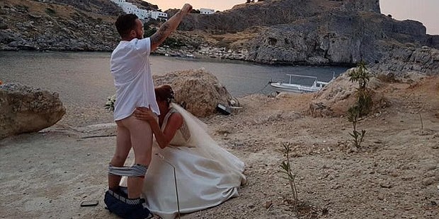 Matthew Lunn, 27 und seine sieben Jahre ältere Gattin Carly haben auf Rhodos geheiratet. Sie wollten sich von den üblichen Hochzeitsfotos abheben und hatten die Idee vor einem griechischen Kloster eine Oralsex-Szene nachzustellen. Die Braut kniet in Weiß vor ihrem Mann, der mit heruntergelassener Hose und Flip Flops siegreich seine Hand empor streckt. Die Szene sollte den einzigartigen Humor der Frischvermählten zeigen.
