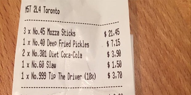 Eine junge Kanadierin hatte wohl eine harte Arbeitswoche hinter sich. Daher wollte sie sich nach getaner Arbeit etwas Gutes tun und gönnte sich ein ausgiebiges Abendessen. Kurzerhand bestellte sie bei ihrem Lieblingslokal in Toronto jede Menge Mozzarella-Sticks und andere Köstlichkeiten für rund 40 Dollar.