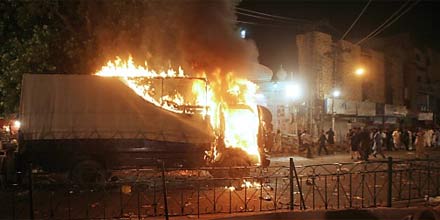 aufgebrachte Massen eine Polizeiwache und Autos an. Einige Polizisten wurden