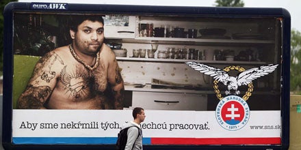 Die Slowakische Nationalpartei (SNS) hat ihre Wahlkampagne mit einem Anti-Roma-Großplakat eingeleitet hat. Es zeigt einen tätowierten Mann und den Satz: "Wir werden solche nicht füttern, die nicht arbeiten wollen".