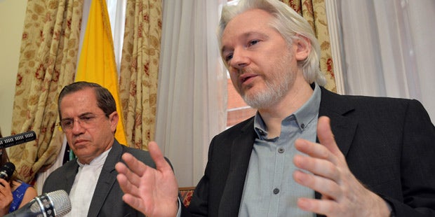 Der 43-Jährige trat zusammen mit dem ecuadorianischen Außenminister Ricardo Patino vor die Presse. Der Australier stellte dabei klar, dass er die Botschaft nicht aus den in Medienberichten genannten Gründen verlassen werde. Der britische Nachrichtensender Sky News und andere Medien hatten berichtet, Assange leide an schweren Gesundheitsproblemen. Er habe Herzrhythmusstörungen, ein chronisches Lungenleiden und gefährlich hohen Blutdruck.