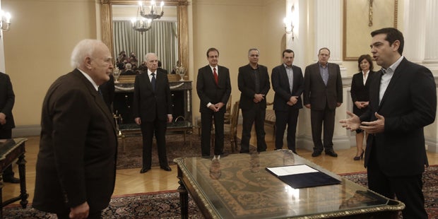 Syriza-Chef Alexis Tsipras ist am Montag als neuer Ministerpräsident Griechenlands angelobt worden. Bei der Zeremonie am Sitz des Staatspräsidenten in Athen versprach Tsipras am Montag, die Interessen des griechischen Volkes zu wahren. Er ist der erste Linkspolitiker an der Spitze einer EU-Regierung. Die Linkspartei Syriza hatte die Parlamentswahl am gestrigen Sonntag klar gewonnen.