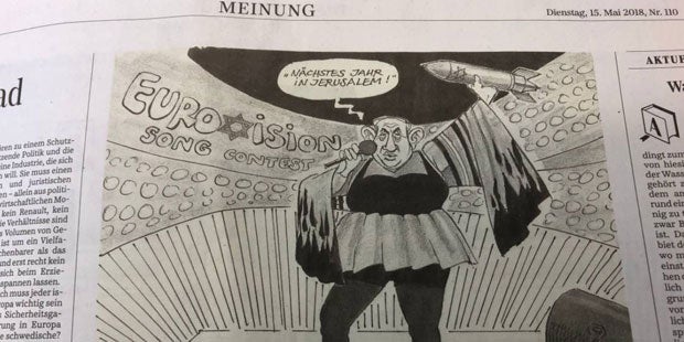 Heute in der @SZ: eine #Karikatur: der israelische Premier Netanyahu verkleidet als #Netta, Gewinnerin des #ESC2018, auf der Bühne eine Rakete schwingend, darauf ein Davidstern & dabei „Nächstes Jahr in Jerusalem“ singend. ->Israelbezogener #Antisemitismushttps://t.co/l89IW2zQha pic.twitter.com/pYUomK4Fq7
