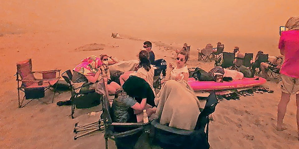 Panik am Strand. Die Polizei eskortierte die langen Auto-Konvois im dichten Rauch aus dem Feuerinferno. Im beliebten Küstenort Mallacoota hatten Urlauber und Einheimische nur noch eine Chance: Flucht an den Strand. Zusammengekauert und mit Schutzmasken saßen Tausende im seichten Wasser und warten auf Hilfe.