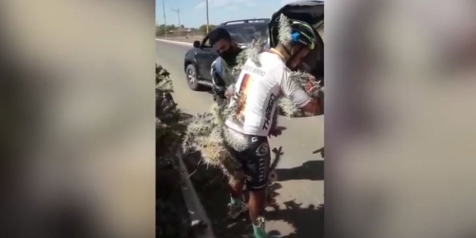 Spektakulärer Unfall: Video zeigt wie einem Radsportler, der bei einem Rennen in einen Kaktusbusch landete, tausende Stacheln aus dem Körper gezogen werden.