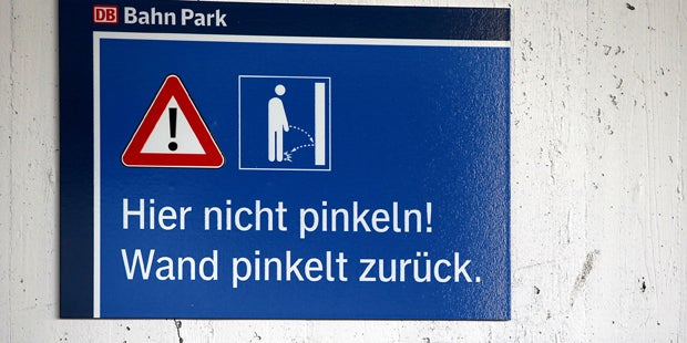 Die Deutsche Bahn schreckt Wildpinkler am Kölner Hauptbahnhof neuerdings mit Schildern ab, auf denen steht: "Hier nicht pinkeln! Wand pinkelt zurück." Die Spezialwand sei mit einem besonders feuchtigkeitsabweisenden Lack beschichtet, teilte ein Bahnsprecher dazu am Freitag mit. Dies führe dazu, "dass der an die Wand gerichtete Strahl etwa im selben Winkel zurückkommt".