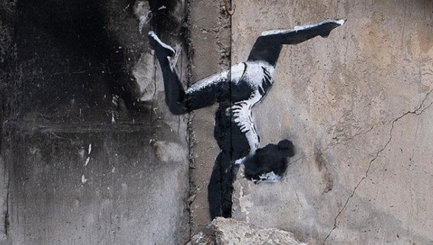 Auf seinem Instagram-Kanal veröffentlichte der mysteriöse Streetart-Künstler am Freitagabend Fotos von einem Werk auf einem zerstörten Haus, die im stark verwüsteten Kiewer Vorort Borodjanka aufgenommen worden sein sollen. Das Bild zeigt auf der grauen Wand eines kriegszerstörten Hauses ein Mädchen, das scheinbar auf Trümmern einen Handstand macht. "Borodjanka, Ukraine" lautet der Begleittext.