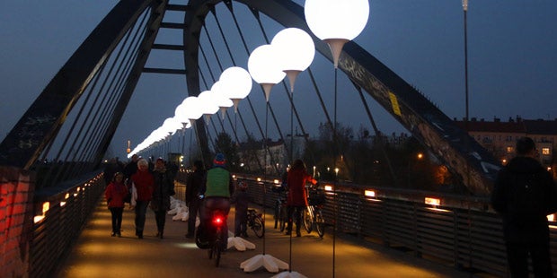Berlin erinnert mit einer großen Lichtinstallation an die Mauer, die vor 25 Jahren fiel. Am Freitagabend eröffnete der Regierende Bürgermeister Klaus Wowereit (SPD) in der Nähe des Reichstags zusammen mit früheren DDR-Bürgerrechtlern die symbolische Lichtgrenze aus knapp 7.000 leuchtenden Ballonen, die auf 15 Kilometern einen Teil der einstigen Grenze nachzeichnet.