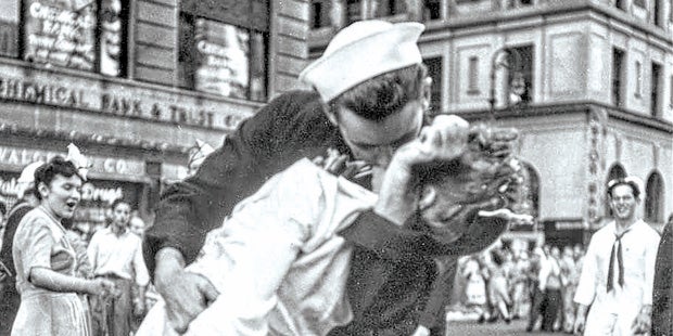 Kein Bild symbolisiert mehr die Freude über das Ende des Zweiten Weltkriegs. Es war der 14. August 1945 am Times Square in New York. Zahnarzt-Assistentin Greta Zimmer Friedman (damals 21) wird vom Seemann George Mendonsa gepackt und geküsst. Die beiden waren sich völlig fremd, auch danach hatten sie keinen Kontakt. Der Fotograf Alfred Eisenstaedt hielt diesen Moment fest, das „Life“-Magazin druckte es auf einer ganzen Seite ab. Das Bild wurde sofort zum Kult. Friedmans Kommentar zum Foto: „Es war kein romantisches Ereignis, es war nur die Freude über das Ende des Krieges.“