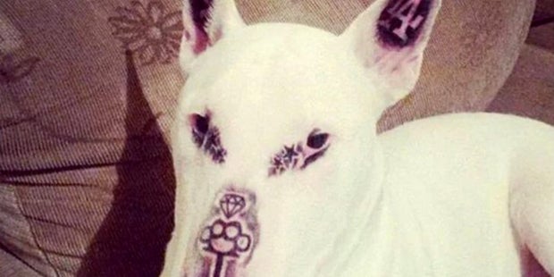 Der Hund, wahrscheinlich ein Bullterrier, hat fünf Tattoos: Ein großes auf der Nase, Sterne neben den Augen und Buchstabenkombinationen in den Ohren.