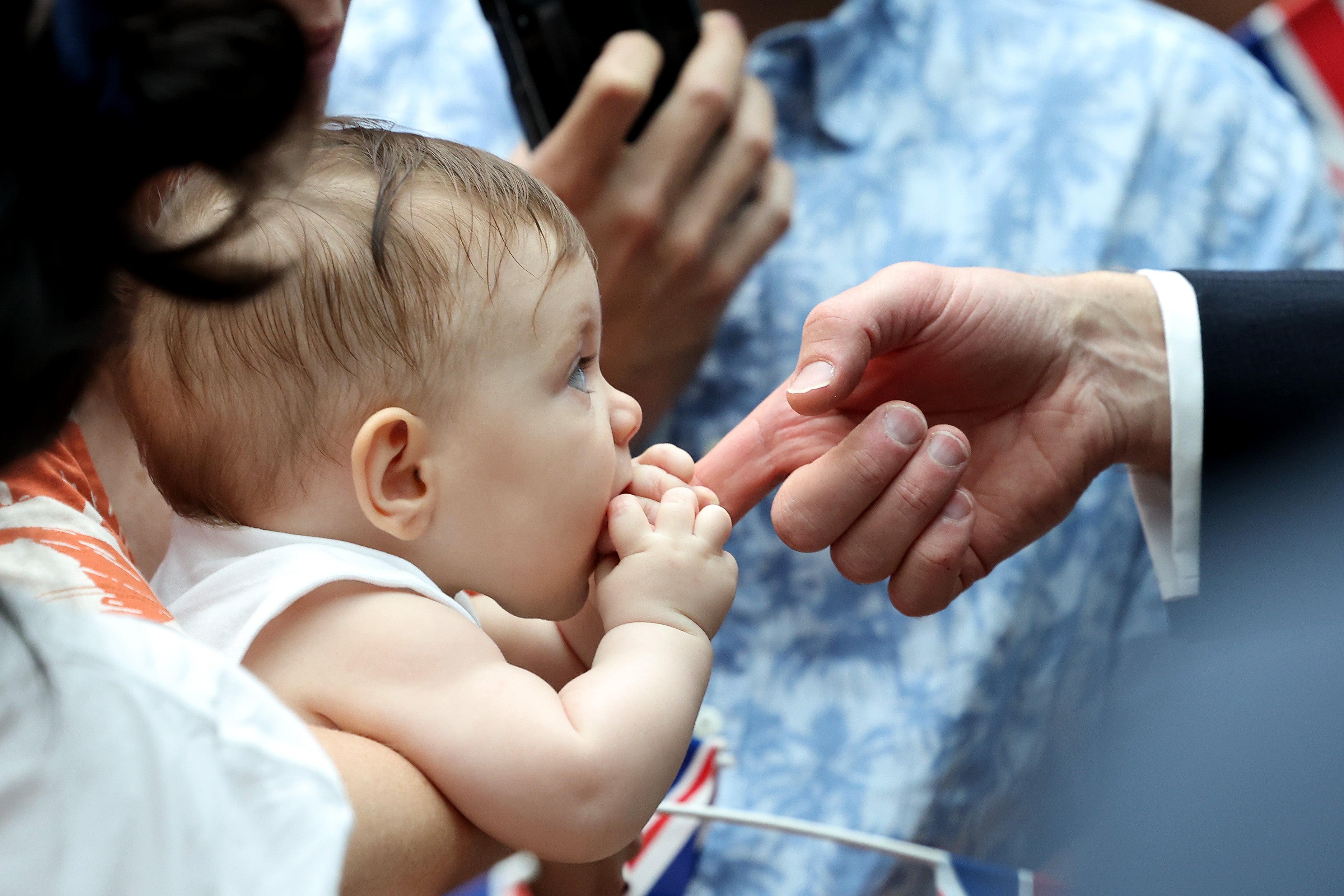 Eine junge Frau spricht mit dem Prinzen, am Arm trägt sie ihr Kleinkind Albane Costa (8 Monate alt). Das Kind hält wohl nichts von royaler Etikette, schnappt sich die Hand des Königs-Sohnes und beißt herzhaft hinein.