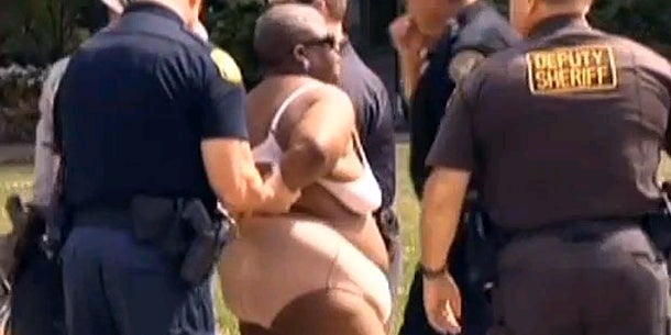 Die Frau wurde von zwei Polizisten abgeführt. Noch ist unklar, wieso sie sich bei der Veranstaltung auszog, denn sie weigert sich, ihr Motiv preiszugeben. Monica D. wird jetzt wegen ungebührlichen Verhaltens angeklagt.