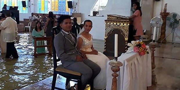 "Wir wollten keinen neuen Termin, weil wir sowieso schon gestresst waren", erklärte die frischgebackene Ehefrau. Wegen der Überschwemmungen konnte die Braut nicht mit dem Auto in die Kirche fahren, wie sie weiter erzählte: "Also bin ich einfach mit dem Boot gefahren." Delos Angeles heiratete den Vater ihrer beiden Kinder, mit dem sie seit sieben Jahren zusammen ist.