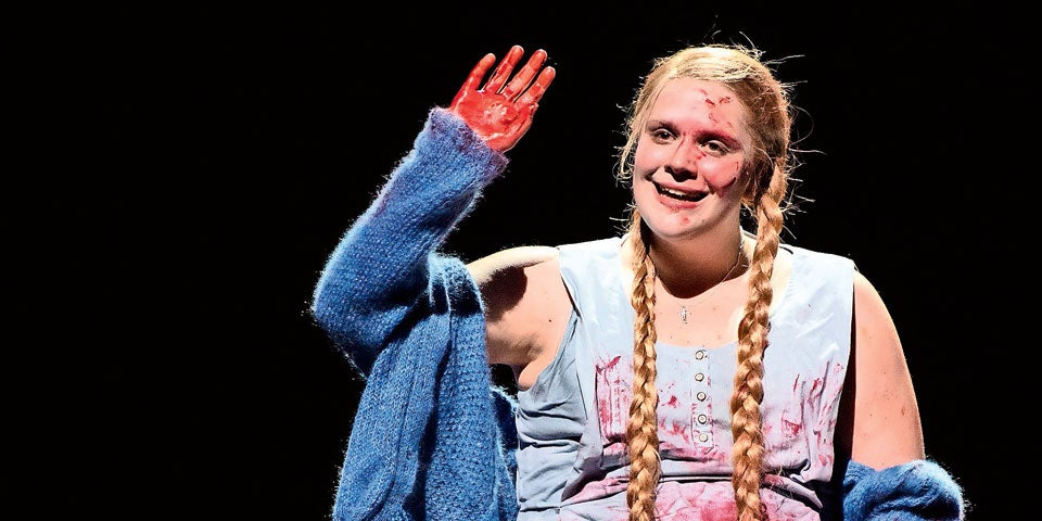 Naturgewalt. Sie wird mit zwei langen blonden Zöpfen und einem blutbefleckten, hellblauen, ärmellosen Arbeitskittel von Thalheimer häufig in der Bühnenmitte in den Scheinwerferkegel geschickt.