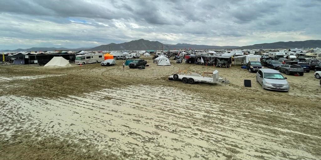 Lot of stuck vehicles trapped by mud about a mile out from the Burning Man festival.