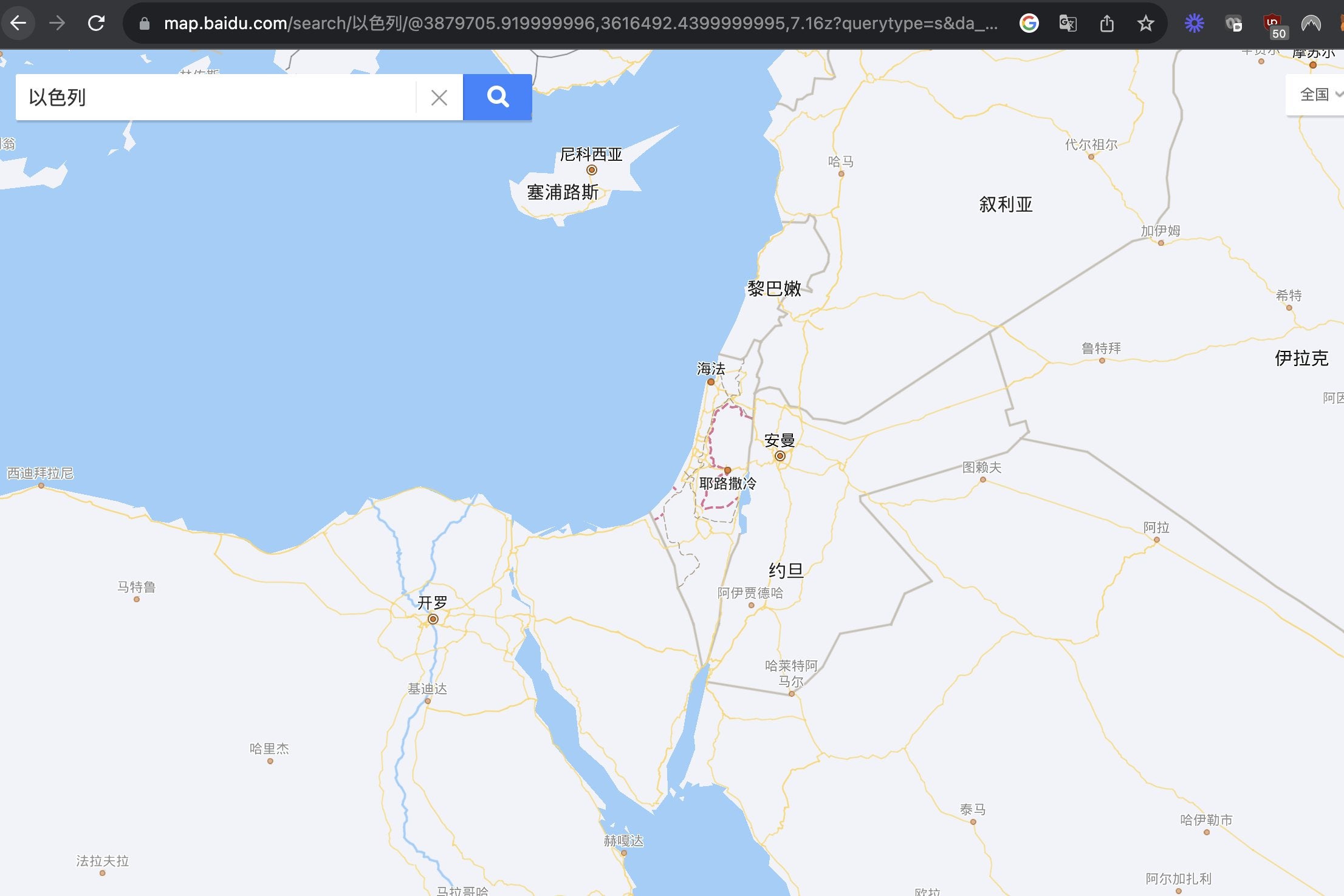 Die Landkarte von Baidu entspricht auch nicht den tatsächlichen Gegebenheiten, sondern gibt den UN-Teilungsplan von 1947 wieder. Damals war auch ein arabischer Staat vorgesehen, der West-Galiläa mit der Stadt Akko, das Bergland von Samaria, das Bergland von Judäa, die südliche Küste bis nördlich von Majdal (heute Askalon), was den heutigen Gazastreifen enthält, und einen Wüstenstreifen entlang der ägyptischen Grenze enthalten. Zu diesem Staat Palästina kam es nie, nach der Ausrufung Israels überfielen die arabischen Nachbarländer 1948 den neuen jüdischen Staat.