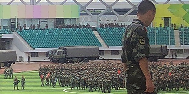 Peking lässt im Sportstadion sein Militär aufmarschieren.