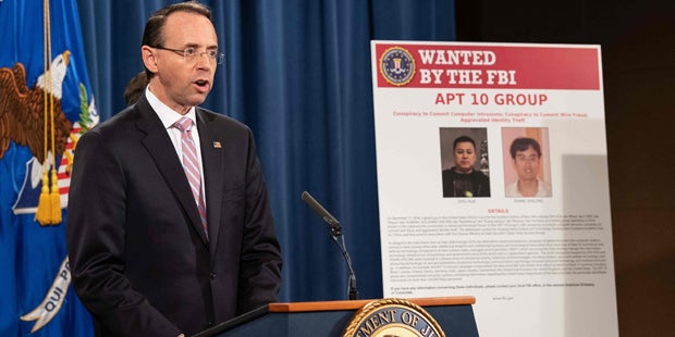 Das US-Justizministerium hat Anklage gegen zwei Chinesen erhoben, Zhu Hua und Zhang Shilong. Beide seien unter Decknamen im Netz unterwegs gewesen - darunter Bezeichnungen wie "Godkiller", "Stone Panda" oder "Red Apollo". Beide seien Mitglieder einer ganzen Gruppe von Hackern, die in der Szene als APT10 (Advanced Persistent Threat 10/"Fortgeschrittene Dauerhafte Bedrohung 10") bekannt ist. Sie seien für eine Firma tätig gewesen, die mit dem chinesischen Ministerium für Staatssicherheit zusammenarbeitet.