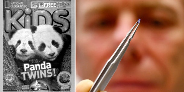 In einem Schweizer Labor ist das kleinste Magazintitelblatt der Welt hergestellt worden. Das Werk zeigt die Frontseite einer "National-Geographic"-Ausgabe und ist mit Massen von 11 mal 14 Mikrometern so klein, dass 2.000 Stücke davon auf einem Salzkristall Platz finden würden.