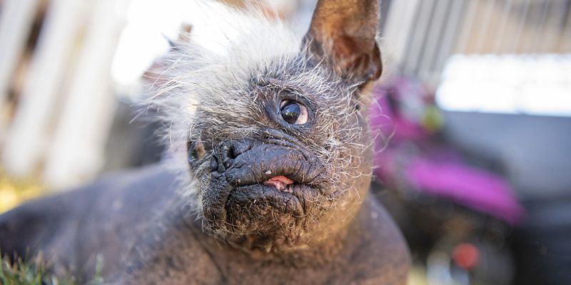 Keine Haare, nur auf dem Kopf ein weißes Büschel, und eine schief heraushängende Zunge: Der Chinesische Schopfhund-Mischling "Mr. Happy Face" ist zum hässlichsten Hund der Welt gewählt worden.
