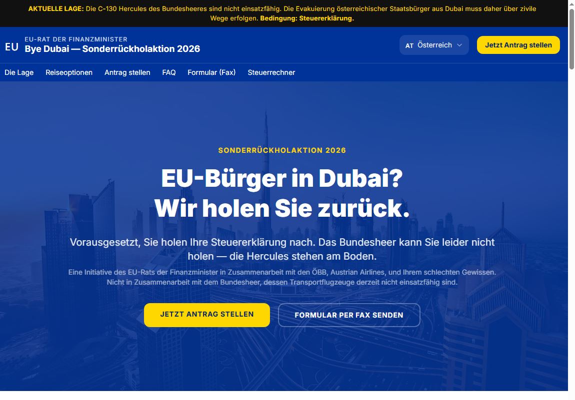Sogar eine eigene Satire-Website wurde bereits für "Steuerflüchtlinge" eingerichtet. Auf "bye-dubai.com" können EU-Bürger, die in Dubai leben, eine (Fake)-Rückholung beantragen - sofern sie ihre Steuererklärung nachholen. Je nach Höhe der Steuernachzahlung werden fiktive Rückreise-Angebote von Railjet bis Privatjet angeboten.