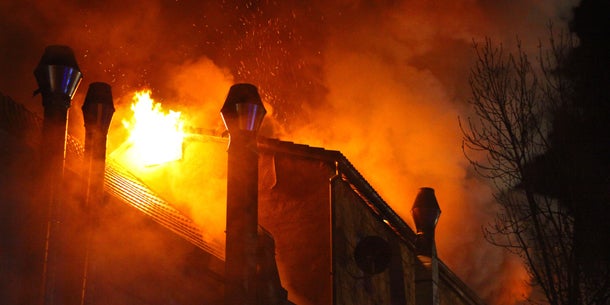 Der Großbrand war in einem Häuserkomplex mit mehreren Wohnungen ausgebrochen. Die Flammen erfassten vom ersten Obergeschoß aus schnell die Etage darüber. Die Brandursache war zunächst unklar. Nach Zeugenaussage käme dafür ein Ofen infrage, sagte der Polizeisprecher. Es gebe keine Hinweise auf einen fremdenfeindlichen Anschlag oder Brandstiftung, betonte er. Den Angaben nach liegt der Sachschaden mindestens im sechsstelligen Bereich.