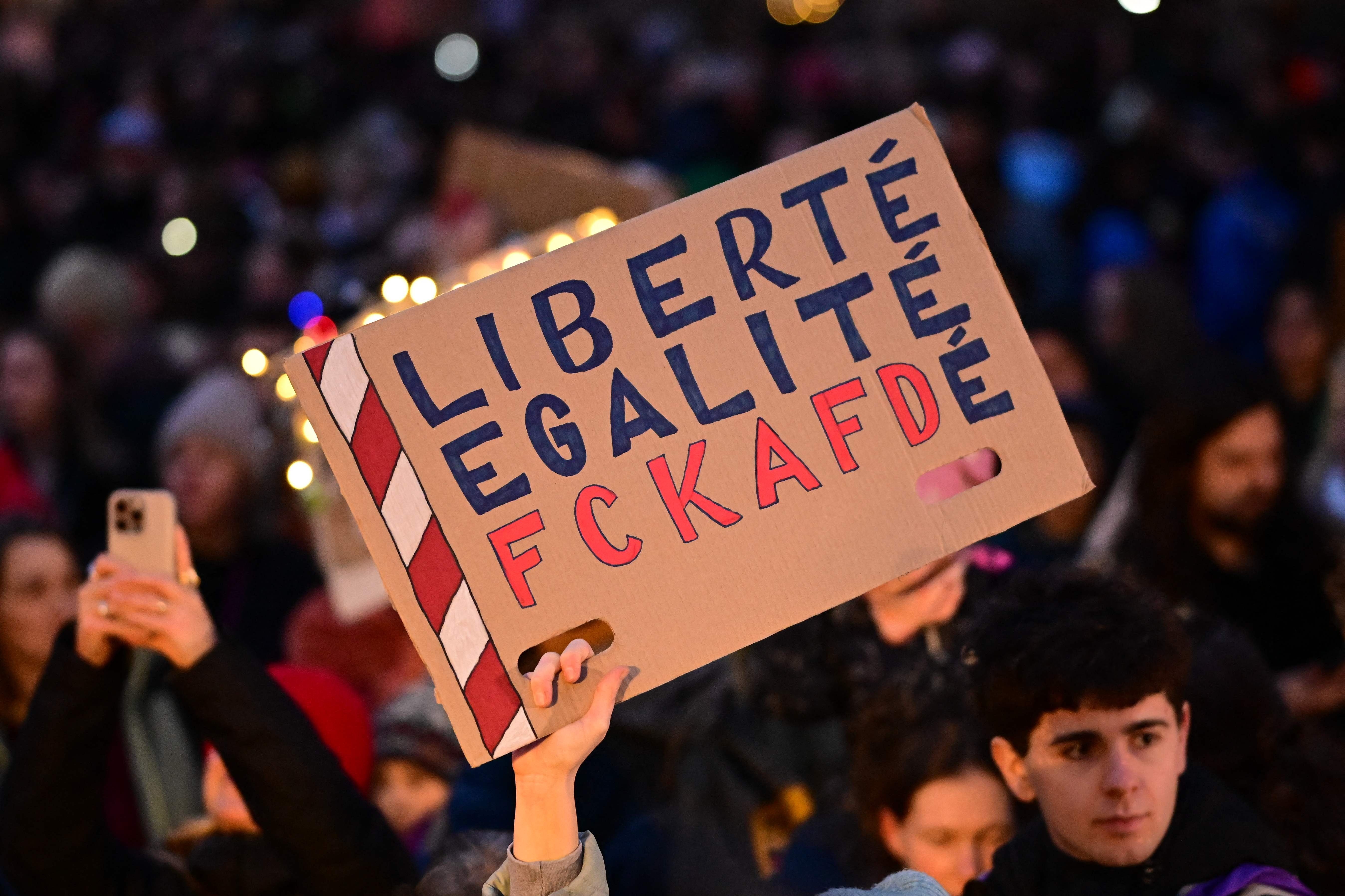 Die Demonstranten skandierten: "Wir sind die Brandmauer." In der Menge standen viele Familien mit Kindern. Etliche Plakate richteten sich gegen die AfD, so etwa die Aufschrift: "Die AfD ist alternativlos blöde."