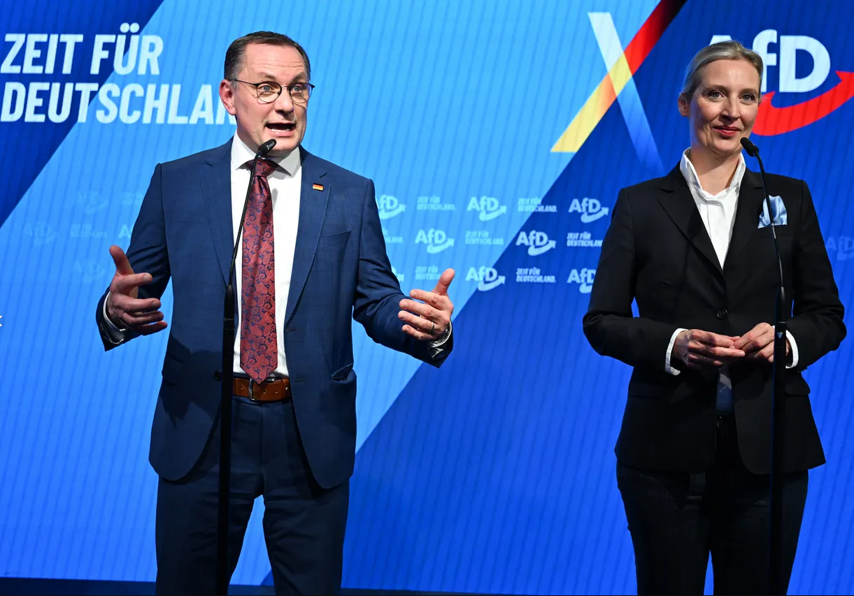 In Deutschland kommt die Rechtsaußen-Partei AfD (Alternative für Deutschland) im neuen ZDF-Politbarometer auf einen neuen Höchstwert in der Wählergunst und zieht mit 26 Prozent erstmals mit der christdemokratischen Union (CDU und CSU) gleich. Demnach gewann die AfD einen Prozentpunkt hinzu, während CDU und CSU einen Punkt verloren. Bereits in einer weiteren Umfrage diese Woche hatte die AfD erstmals geführt.