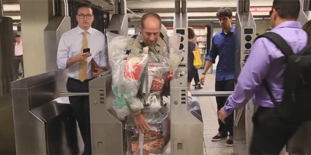 Mit einem ungewöhnlichen Projekt macht der Umweltaktivist Rob Greenfield derzeit die Bürger New Yorks auf Verschwendung natürlicher Ressourcen im Alltag aufmerksam: Während er sonst auf einen sparsamen und ökologischen Lebenswandel achtet, hat Greenfield es sich zum Ziel gesetzt, einen Monat lang auf dem landesüblichen Konsumniveau zu leben und allen Müll, den er produziert, bei sich zu tragen.