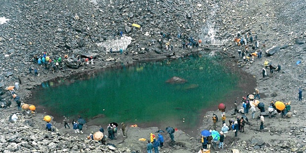 Der See Rupkand, der in dem nordindischen Staat Uttarakhand in einer Höhe von 5029 Metern liegt, ist nur zwei Meter tief. Meistens ist er mit Eis und Schnee bedeckt, nur ganz selten bekommt man die Oberfläche zu Gesicht. Als es im Jahr 1942 einmal sehr warm war, geschah genau dies - und ein Geheimnis wurde offenbart.