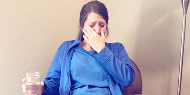 "Sie wird mich umbringen, dass ich dieses Bild poste, aber können wir eine Minute alle Hebammen würdigen?", schreibt Laura McIntyre auf Facebook. Dazu teilt sie ein Bild ihrer Schwester Caty. Sie sitzt in Tränen aufgelöst und erschöpft auf einem großen braunen Ledersessel. Auf ihrem Schoß ein Teller mit Essen. In ihrer rechten Hand hält sie ein Glas mit Wasser, mit ihrer linken Hand wischt sie sich die Tränen aus dem Gesicht.