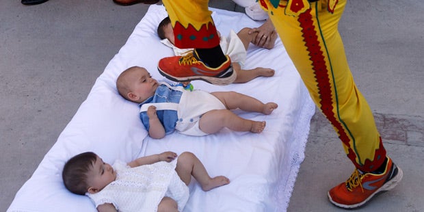 Als Teufel verkleidete Männer haben in Castrillo de Murcia am Wochenende Babys eine Taufe der besonderen Art beschert. Immer am Sonntag nach Fronleichnam werden im nordspanischen Ort vor vielen Schaulustigen mehrere Neugeborene auf eine Matratze gelegt. Dann kommt der gelb-rot gekleidete Beelzebub, der hier "El Colacho" heißt, nimmt Anlauf - und macht einen mächtigen Satz über die Kinder hinweg.