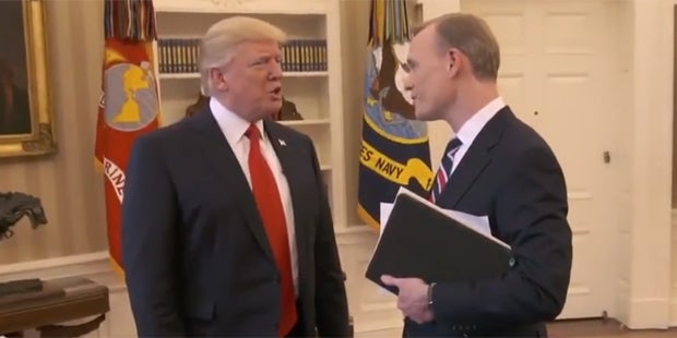 Allerdings wollte der Präsident dann plötzlich nicht mehr darüber sprechen. Dickerson blieb stur und sagte: "Ich frage, weil Sie keine Fake News wollen. Ich will es von Präsident Trump hören." Daraufhin antwortete Trump: "Sie müssen mich nicht fragen. (…) Ich habe meine Meinungen und Sie haben Ihre". Als Dickerson erneut nachfragte, wurde es dem Präsidenten zu viel. "Das reicht. Danke sehr", sprach er und beendete das Gespräch damit, dass er sich an seinen Schreibtisch im Oval Office begab und Dickerson damit unmissverständlich eine Aufforderung zum Gehen verpasste.