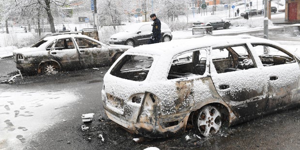 Bei Ausschreitungen in Migrantenviertel wurden Autos angezündet und Geschäfte geplündert