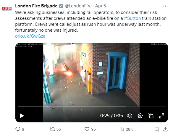 Im Südlondoner Stadtteil Sutton trug sich am Wochenende ein brenzliger Unfall zu. Wie auf einem Video bei X zu sehen ist, ging dort am U-Bahn-Steig ein E-Bike urplötzlich im Flammen auf. Die Aufnahme veröffentlichte die "London Fire Brigade" (LFB). Wie durch ein Wunder wurde bei der Explosion niemand verletzt.