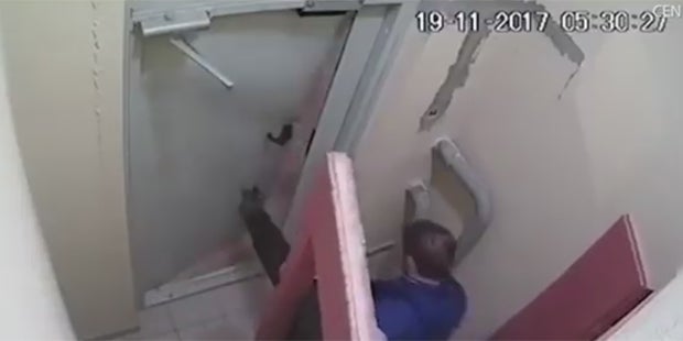 Das nennt man Beständigkeit. Ein betrunkener Russe hat drei Stunden lang versucht, eine Tür aufzubekommen. Zuerst sieht man, wie er gleich mit der ersten Tür Probleme beim Durchschreiten hat, bevor er dann versucht, mit einer Serie von Tritten die zweite Tür zu öffnen.