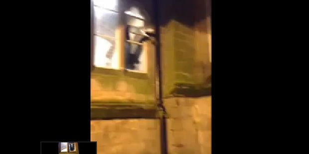 "Wir kamen auf dem Weg von einer Party zufällig vorbei und sahen ihn da hängen. Ich dachte erst, es sei ein betrunkener Student", sagte Dan De-Niet, der an der Universität Nottingham Trent studiert, dem Magazin "The Tab". Er filmte den Vorfall in der Nacht auf Freitag, bevor er den Notruf wählte und Polizei und Feuerwehr zur Rettung des Einbrechers eilten. Die Beine des unglücklichen Einbrechers sind auf YouTube zu sehen.