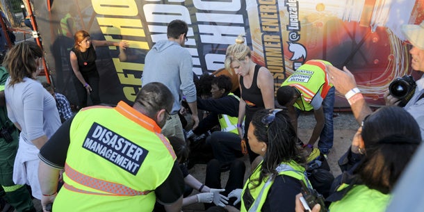 Eine Frau sei den schweren Verletzungen erlegen, die sie bei dem Einsturz des Werbegerüsts erlitten habe, sagte die Sprecherin der Stadtverwaltung von Kapstadt, Kylie Hatton. Das Gerüst mit dem Werbebanner war demnach bei starkem Wind auf einem Parkplatz eingestürzt. Das Konzert fand wie geplant statt, nachdem die Polizei den Veranstaltungsort für sicher erklärt hatte.