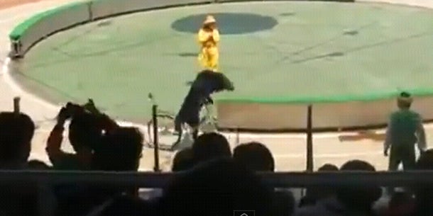Zu sehen ist, wie sich ein Bär und ein Affe bei einer Vorführung in der Arena des Shanghai-Wildtierparks ein Fahrradrennen liefern. Nachdem der Affe stürzt und den Bären damit zu Fall bringt, fällt der Bär über den Affen her, beißt und kratzt ihn. Zoowärter prügeln daraufhin mit Holzstöcken auf den Bären ein, bis er von seinem Opfer ablässt.