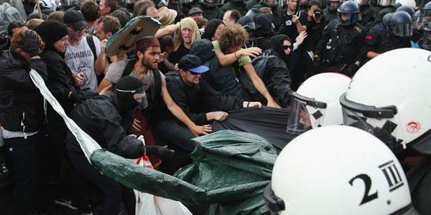 Ein Beamter sei bei der Auseinandersetzung am Auge verletzt worden. Das Bündnis "Stop G7 Elmau" berichtete von mehreren verletzen Demonstranten. Sie wurden von Sanitätern behandelt. Die Gipfelgegner machten die Polizei für die "Eskalation" verantwortlich und sprachen von einer Festnahme. Die Sicherheitskräfte waren mit tausenden Beamten in Garmisch-Partenkirchen im Einsatz. Viele Bürger hatten ihre Häuser vorsorglich mit Sperrholzplatten geschützt.