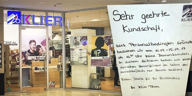 Der Fall konkret: Ein syrischer Friseur sprang bei einer Filiale der Friseurkette Klier ein. Allerdings, da er als Mann in Syrien nur den Beruf des Herren-Friseurs erlernt hat, brachte eine Mitarbeiterin ein Schild am Fenster an: „… haben wir einen syrischen Herrenfriseur im Salon, der ausschließlich nur Herren bedient.“