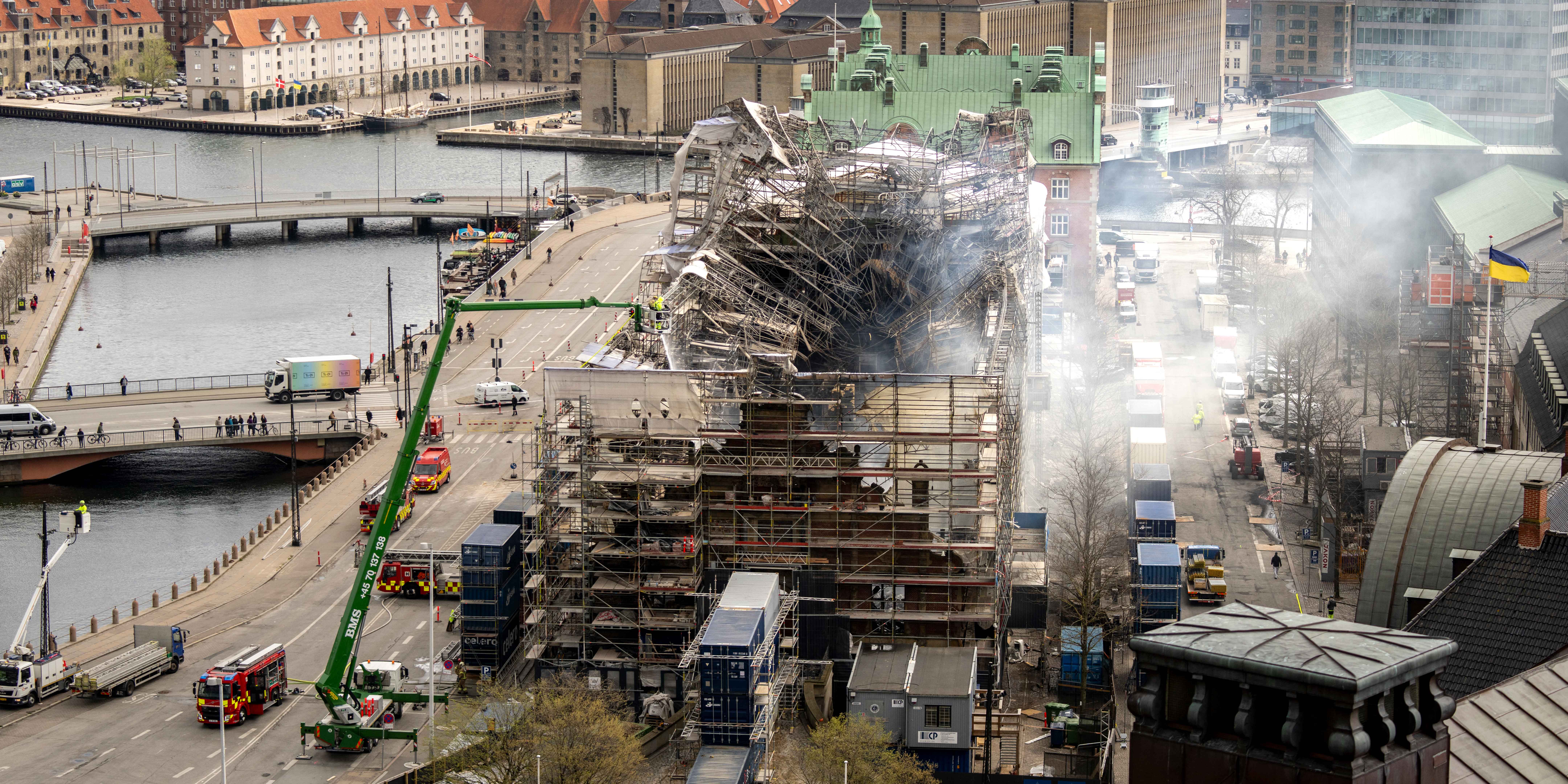 Das Gebäude, das vor 400 Jahren errichtet wurde, liegt auf der östlichen Spitze der Insel Slotsholmen am Holmens Kanal gegenüber der Dänischen Nationalbank und ist eine Touristenattraktion. Im näher zum Parlament liegenden Teil des wegen Restaurierungsarbeiten eingerüsteten Bauwerks wütete das Feuer am Dienstag besonders schlimm. Nach kurzer Zeit stürzte bereits die markante Turmspitze der alten Börse ab.